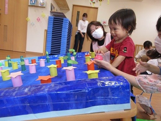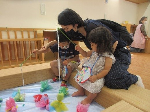 【金魚釣りコーナー】揺れる釣り糸の先に磁石がついていて、ピトッとくっつくと嬉しいね!たくさん釣れました。ワイルドに池の中に入って、つかみ取りも男らしくって素敵~☆