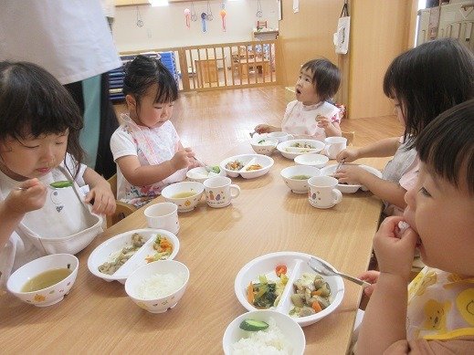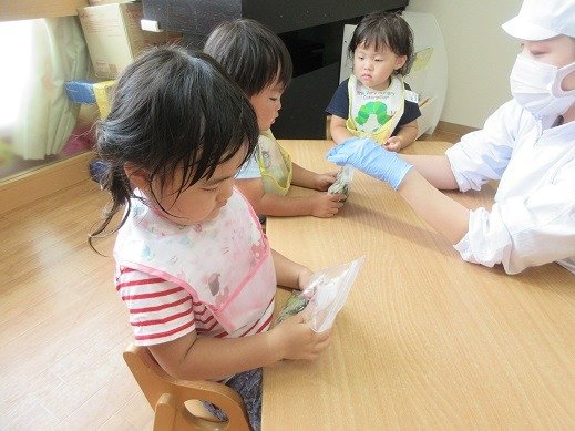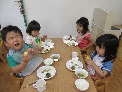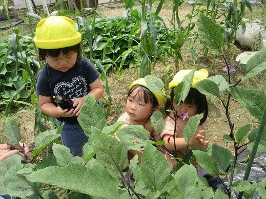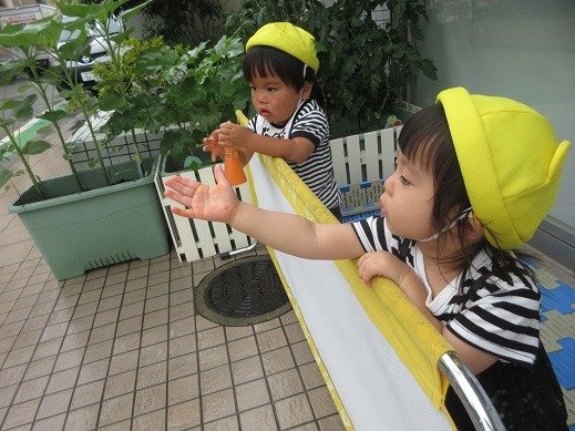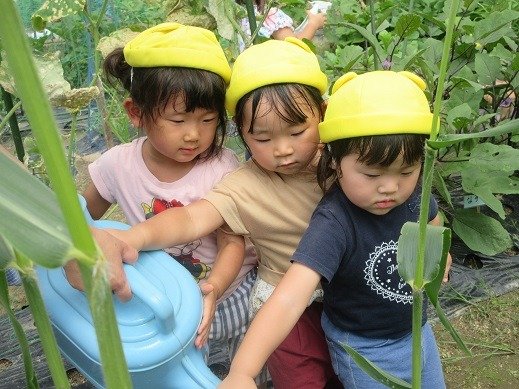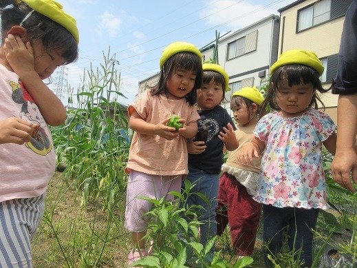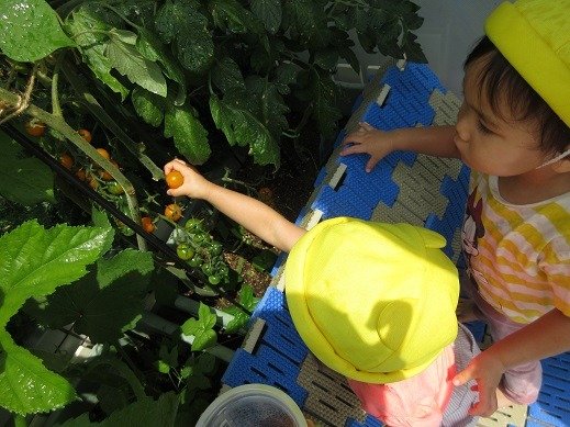 保育園前のミニトマトやオクラもいっぱいできて、給食にでてくると「さっきとったやつやなぁ」と、嬉しそうな子ども達。