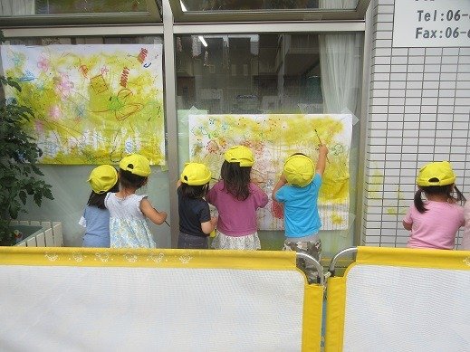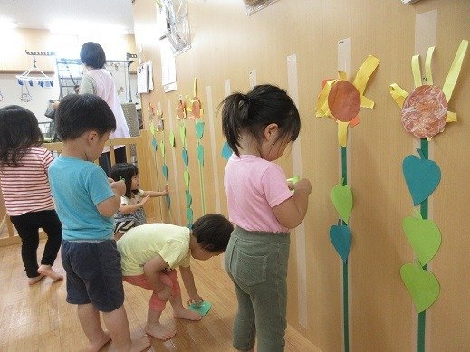 ひまわりー!そうなんです。保育園の向日葵が咲いたんですよ。去年、農園で育てていた向日葵の種から育てたかわいい向日葵です。みんなで向日葵と背比べをして、葉っぱの数を数えて…葉っぱを貼っているところ。きれいに葉っぱが並んでいてたのしいね。