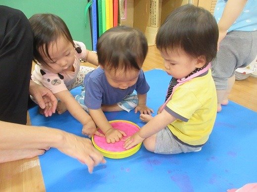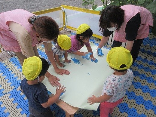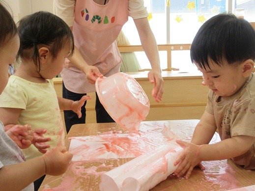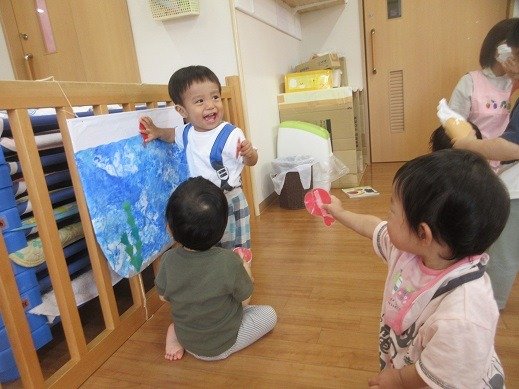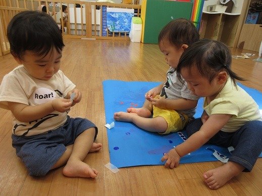 スタンプ台を使うと、絵の具とはまた違って「なになに?」と興味津々です。小さなおててや足の型がいっぱいついた画用紙がかわいいんですよ~。