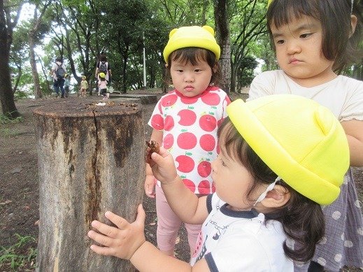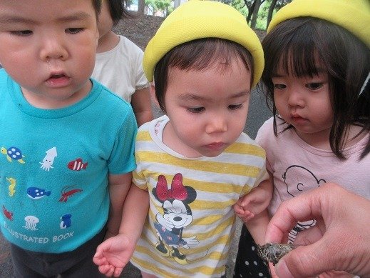 ほらーっ セミだよ。やっとセミの声が聞こえるようになってきましたね。夏です 夏!「触ってみる?」指先でチョンチョンっとつついてみます。