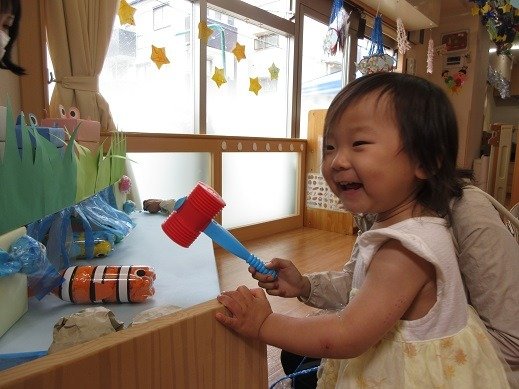 ここは、【お魚パニック】ひよこ組(0歳児)のお友達には、叩くゲームは難しいので、お口をあけたカバくんに、魚を食べさせてあげるゲームにしました。
