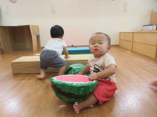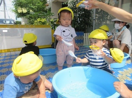 水にも慣れて、おもちゃを見つけて水をすくったり、手を濡らして気持ちよさそうに遊んでいます。暑い日は水遊びがいいですね。今週は、びっくりするような雷と雨でしたね。