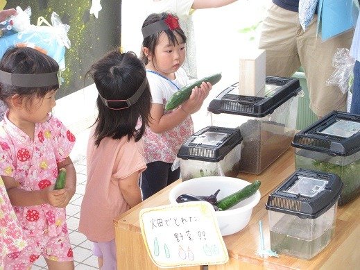 朝、収穫したばかりのキュウリやトマトをお披露目。それから、メダカ(赤ちゃんもいっぱい産まれています)・カタツムリ・みんながとってきたオタマジャクシ。最近仲間入りしたカブトムシ。卵を産むかな?と楽しみにしています。