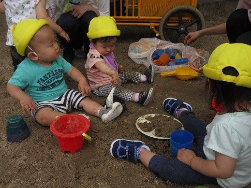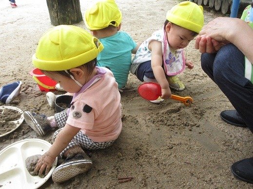 おててで泥んこを握ってムニュ。不思議な感触に夢中です。この夢中になっている時の表情、いいですよね。大好きです。笑顔ももちろんかわいくてキュンキュンですが、何か考えている時の子ども達って魅力的だなぁと思うんですよね。