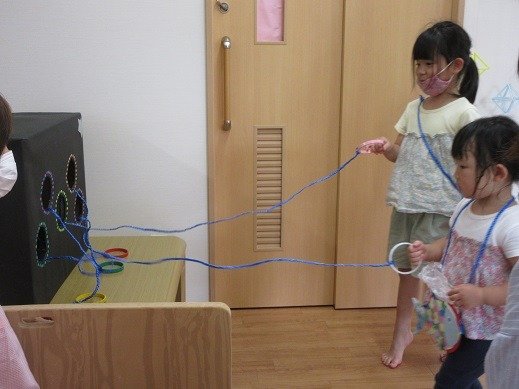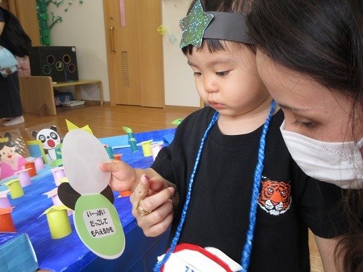 【くじびき】好きな色の輪っかを引っ張ると…ながーーーい ながーーーい。あれ、みじかい!笑。ポン!と出てきたのは、頭につける星かざり。良く似合うね。