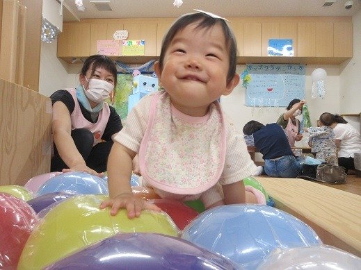 【風船マット】!ふかふかしてきもちいいねー。大人が乗っても割れないらしいけど、ちょっと勇気がいりますよね。試してみましたが割れませんでしたよ!