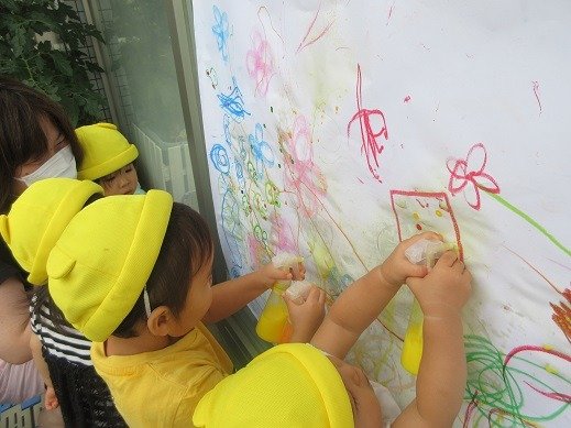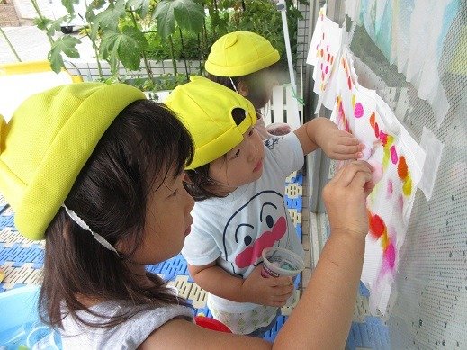キッチンペーパーに、サインペンで描いたカラフルな〇を的にして水鉄砲をすると、色がジュワーっと流れてきれい!スプーンですくって濡らしたり、フワフワの丸いポンポンを使うと、色がにじんでいく様子が、じっくり観察ができたようで「うわぁ!!」と感動の声。