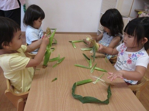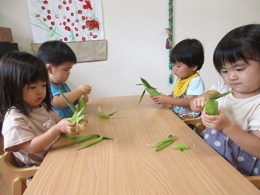農園では、夏野菜がどんどんと収穫できています。トウモロコシはちょっと小さめだったけれど、これがびっくりするほど甘い!みんなで皮むきをしてくれました。