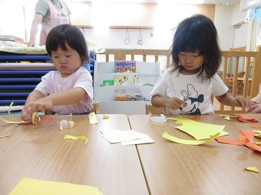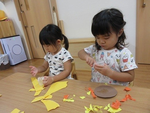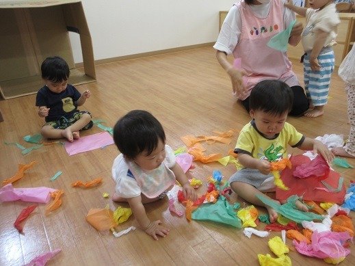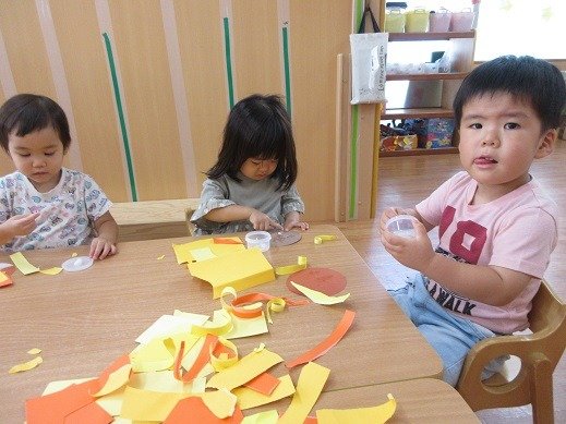 太陽グループさん、画用紙をビリビリ。ここに糊を使ってペタペタ。さぁて 何ができるのかな?