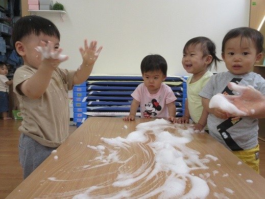 わっはっは!!泡をつかんで パチン!あちらこちらに泡がふわっふわっ。