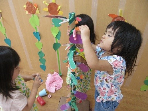 洗濯バサミで器用につけたりはずしたりと、収穫遊びをしたり
