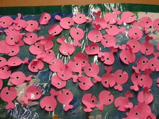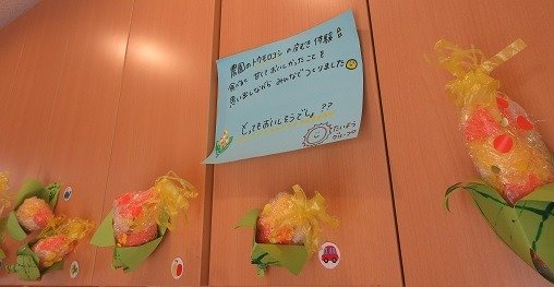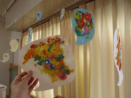 星グループさんの部屋の窓際には カラフルなおばけちゃんがゆら~り ゆら~り。おめめが あちらこちらについていて、愛くるしいおばけちゃん達です。