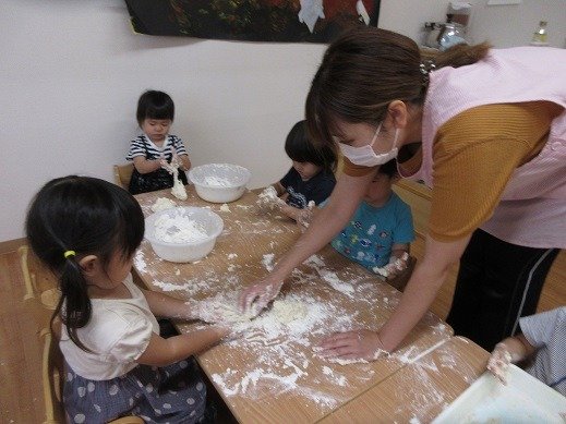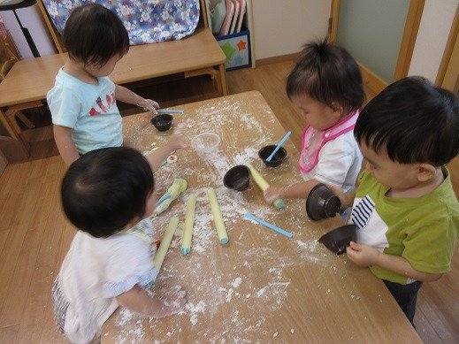 粉がまとまるように、塩を足したり、水をたしたり、油を足したりと、いろいろなバリエーションであそびます。テーブルいっぱいに広げて粉まみれ(笑)