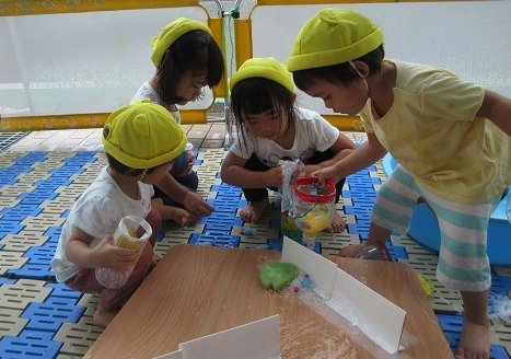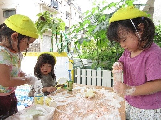 泡といっても、いろいろ。シャボン玉で作った泡や、石鹸で作った泡。泡の感触も変わります。泡アートもそれぞれ。泡モコ遊びブームです。