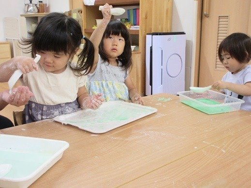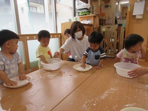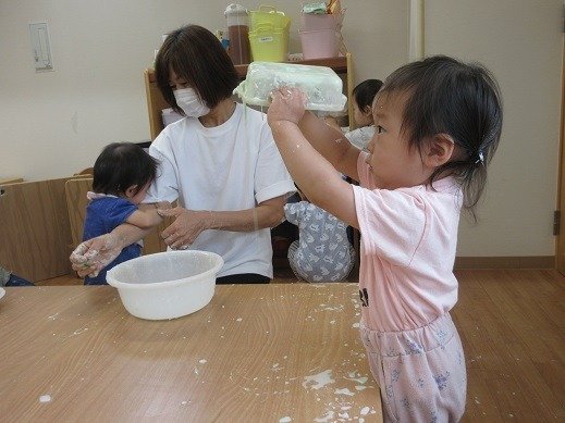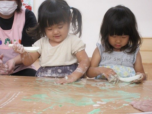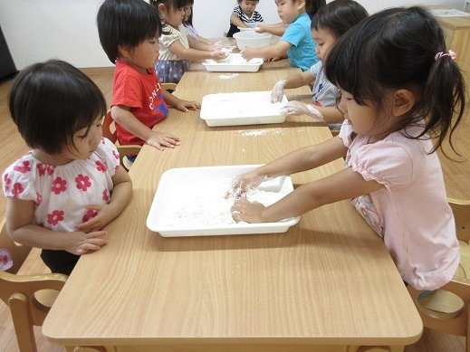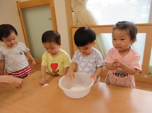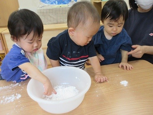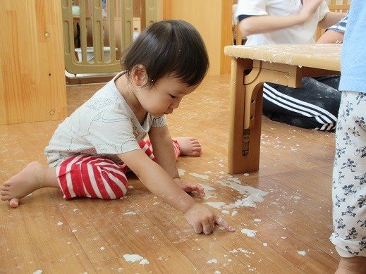 遊びこんだといえば…片栗粉遊び。粉をツンツン。なになに?覗き込んで見つめる子ども達。