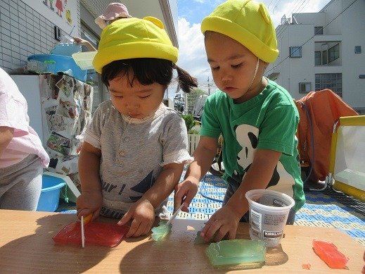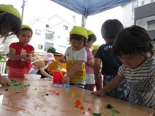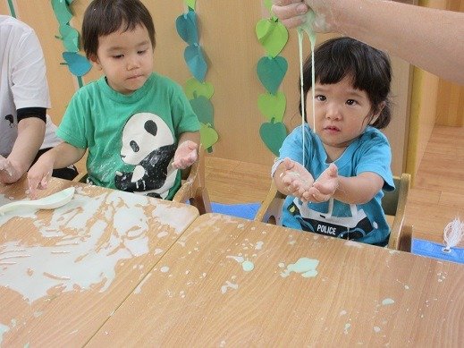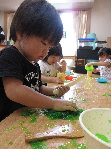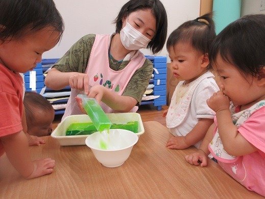 オヤツの後は、ゼリーの感触遊びをしましょう。ところてんを作るみたいに、するする~っとゼリーが出てきておもしろい!