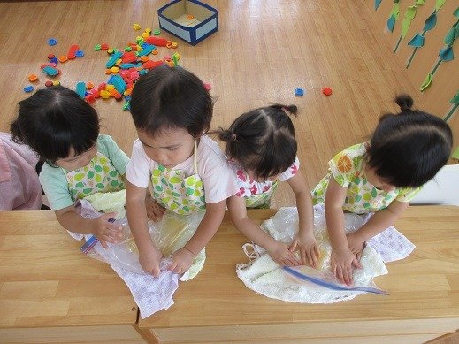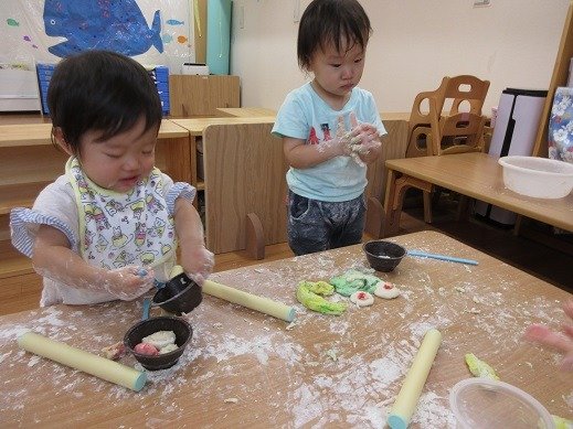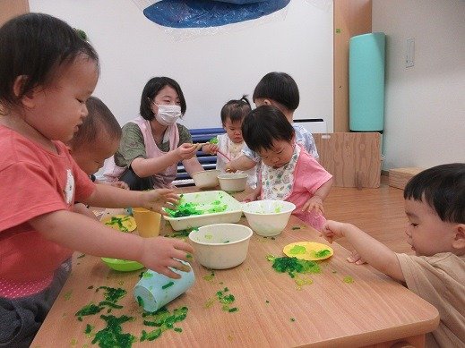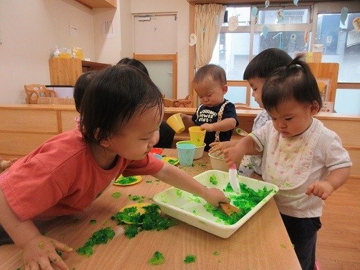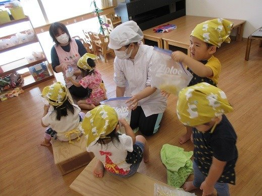 みんなが作ったシャーベット。ほら、かたまっているの分かりますか?もう少し冷凍室でかためて3時のおやつにいただきました。おうちでもつくってみたよ!というお話が聞けて嬉しいな。フリフリタイム!最高!遊びで、ジプロックを見つけたお友達が中に玩具をいれてモミモミしていて、浅漬けを作った時を思い出しているのかも…とニンマリした先生。自由にジプロックが使えるように準備してくれました。簡単クッキングもブーム!