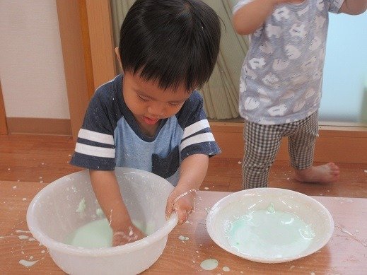 グルグルかき混ぜて、重たいところと軽いところがおもしろい。片栗粉の感触をじっくりと味わってみています。