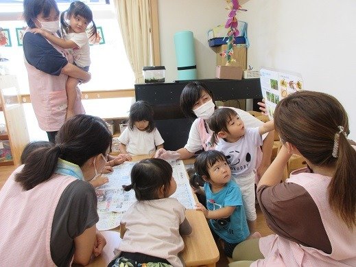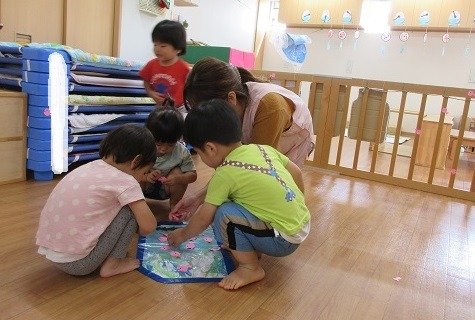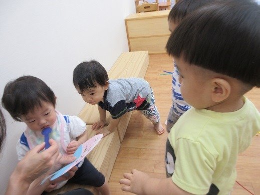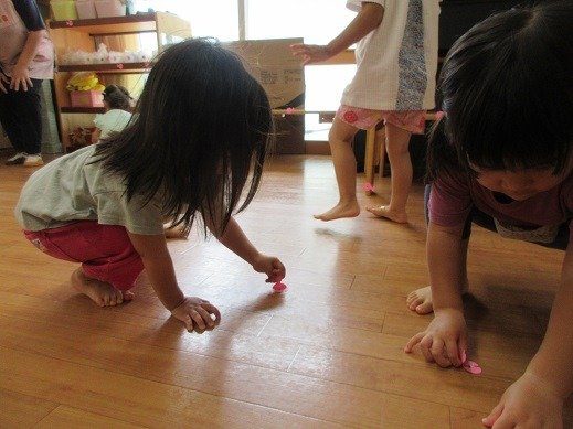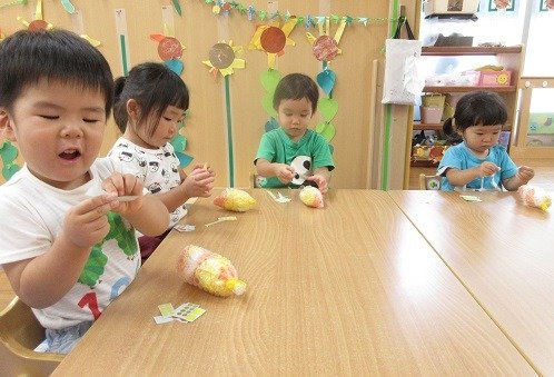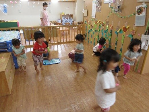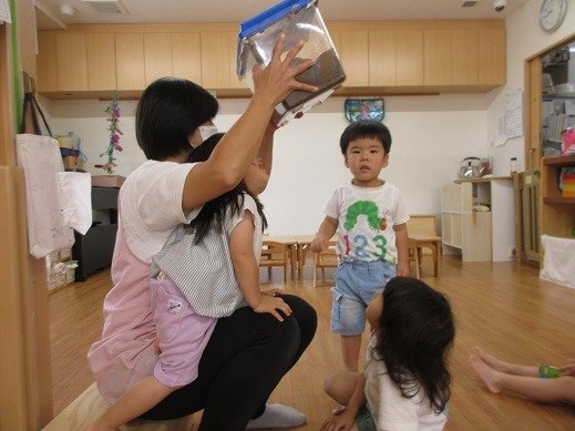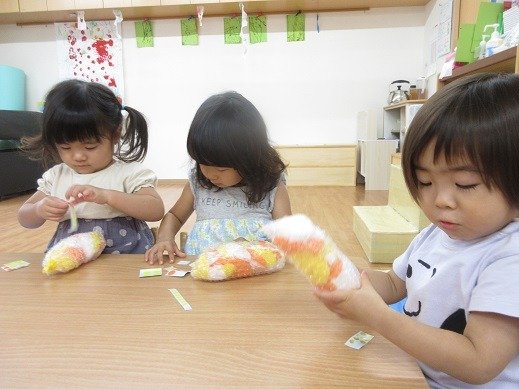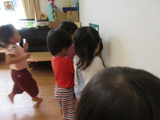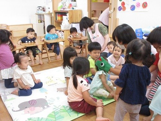 お楽しみ会では、今、子ども達の間で大人気のカエルさんが登場!カエルさんが見てくれたら、いろんなことをがんばれちゃったり、心が安定したりするお友達もいて、パペット入れから、顔とちょこんと出して、片付けています。見えないと「カエル寝てる?」と様子を見に来てくれるんです。カエルさんブームです!そして、わらべ歌も大好き。9月18日の『いっしょにあそぼう会』が楽しみですね。