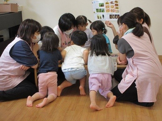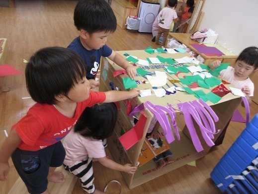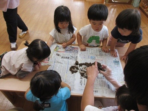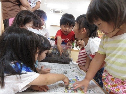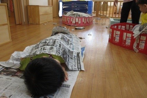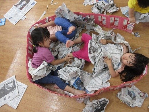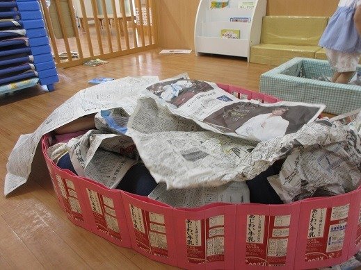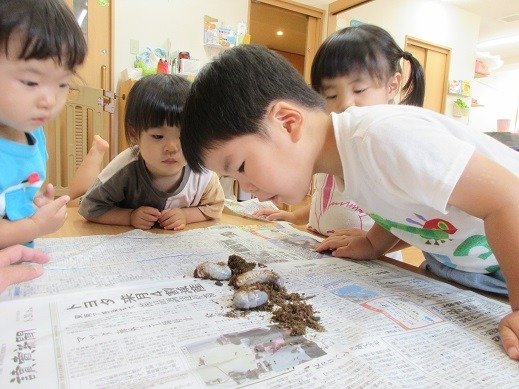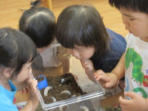 お部屋のあちらこちらにできたケース(囲い)に、新聞紙を持ち込んで幼虫ごっこを楽しんでいましたよ。気づいた事を自信をもって発したり、人に思いを伝える力も育っています。また、文字や数、大きさ、模倣やなりきり遊びなど、幅広い育ちに繋がっています。幼虫の観察を、楽しく続けていきたいと思っています。