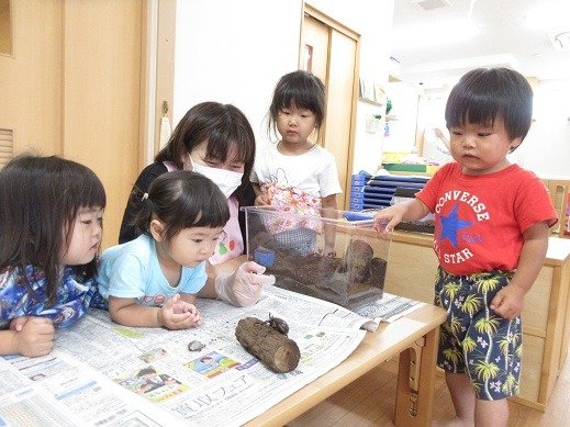 太陽さんの部屋の前には 力強いカブトムシ。保育園のカブトムシは『かぶちゃん』と名前をつけて可愛がっていて、なんと卵を産み、幼虫になったんです。