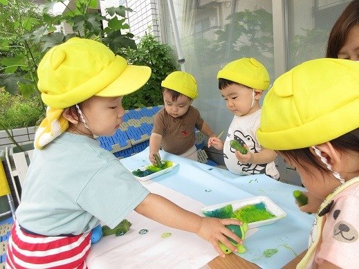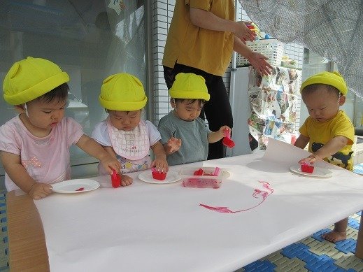 大きく育った丸オクラでスタンプ。絵の具やスタンプなんでもやってみたい!という意欲がいっぱいの星グループさん。
