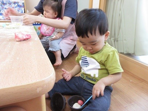 個々の遊びが中心の時期には、十分それを見守ります。これを移しかえてみようかな?このカップの形はどんなかな?こぼれないようにするには…いろんなことを学んでいるんですよね。