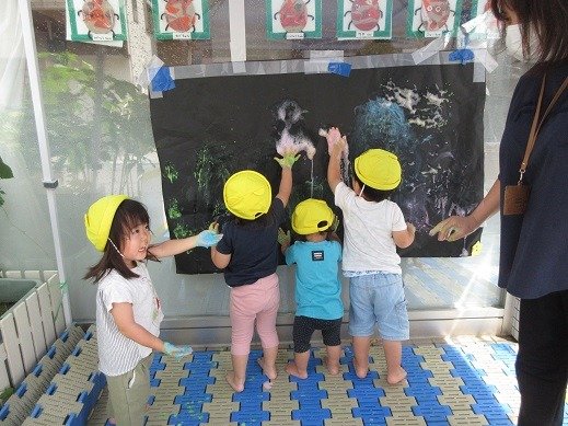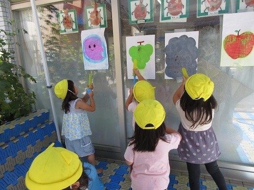 的を狙って、水鉄砲をしゅー!!!あらあら不思議。絵の具が流れて、現れたのは…おいしそうな果物たち。的を狙う姿もかっこいいでしょう。