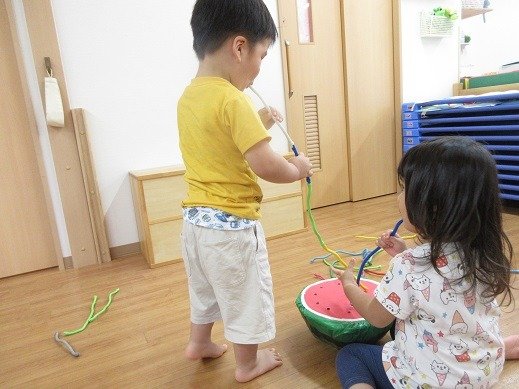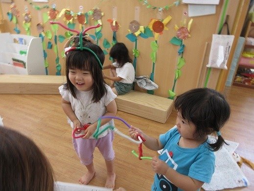 一人遊びが中心の時期から、お友達と遊びを共有するようになると、ごっこ遊びも盛り上がって楽しそう。この日は、そうめん(スズランテープ)流しをしているんです。みんなで覗き込んでかわいいですよね。