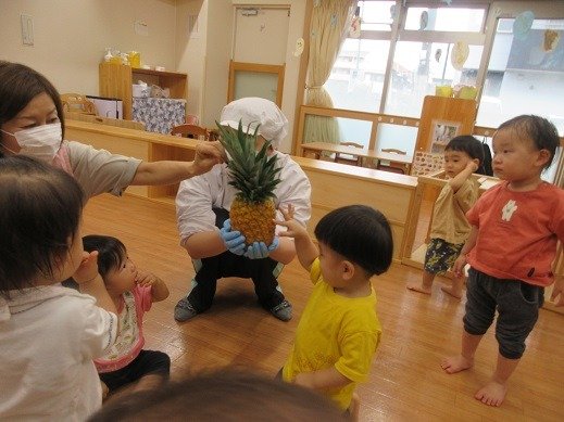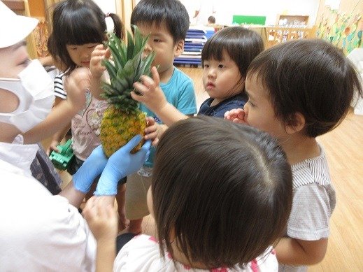 「これなーんだ?」朝のおやつはパイナップル!みんなのお顔ぐらい大きなパイナップルの登場に、大喜びです。葉っぱ、かたかったね。黄色いところもかたいんだね。さぁさぁ、朝のオヤツにしましょう。
