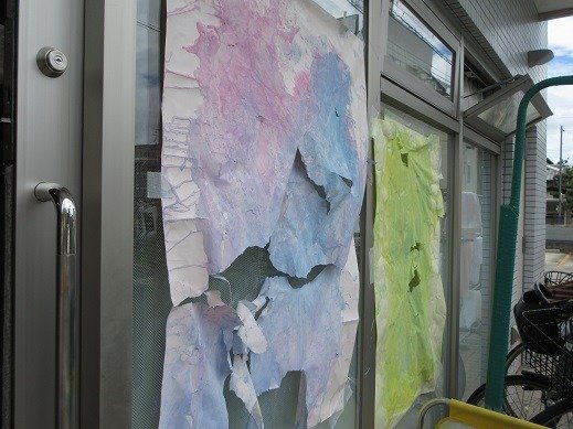 よっこらしょ!足をあげて おっとっと。ぺたっ。窓にも素敵なアートができました。
