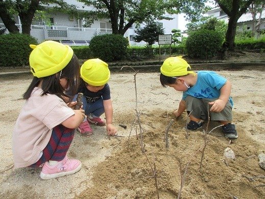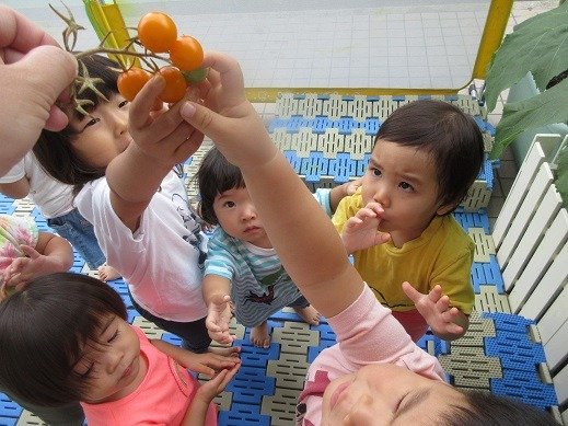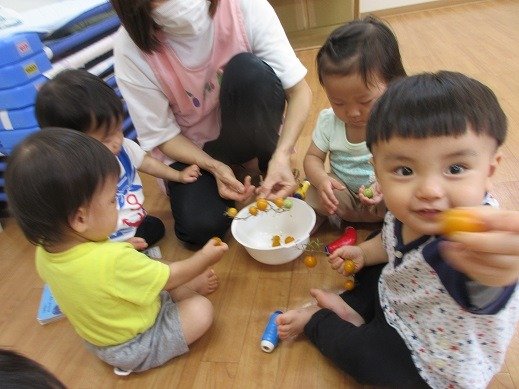 プチトマトも、もうそろそろ終わり。収穫したミニトマトはドライトマトにしていただきました。ドライトマトにしたら、甘味が凝縮されるので、おかわりしたいお友達が続出!半分に切ったプチトマトに塩を少しふり、オーブンで焼くだけで簡単にできるので、子ども達のおやつにも良いですね。