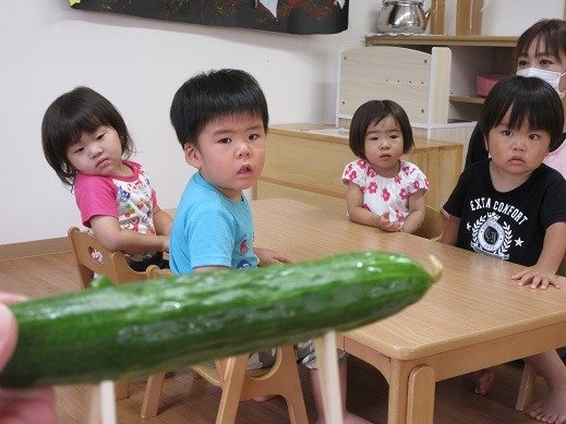 農園で収穫した、キュウリとなすびを使って、精霊馬と精霊牛を作りました。子ども頃、祖母と一緒に作って飾っていたのを思い出します。子ども達のご先祖様が、保育園にも遊びに来て、この子達を温かく見守ってくださることでしょう。コロナウイルスの感染拡大が広がり、お墓参りもいけないご家庭もあるかもしれません。みんなが健康で過ごせることを願います。
