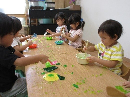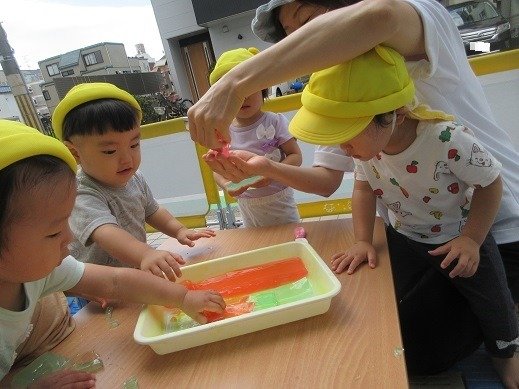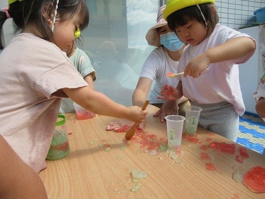 お部屋ではなにやらおいしそうなかき氷を作っていますね。ピンクのおいしそうなかき氷はイチゴ味かな?絵の具遊びをしたの覚えているかな?
