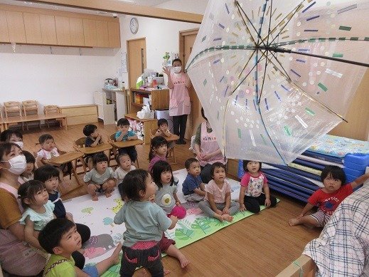 これは傘の花火!お楽しみ会のお話が「花火」で、「しゅーーーどーーーん!!!」効果音の繰り返し言葉が気に入った様子。全身を使って花火を表現する動きが、それはそれはかわいくってかわいくって。子ども達の仕草ひとつひとつ、和みます。夏の終わりの花火もこれからブームになりそう。