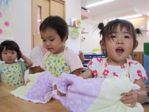 いいな~くま組さん…と見守っているうさぎ組さんも、エプロンをつけて気分はくま組さん。同じようにタオルでくるんだジュースと、氷を渡してもらって、フリフリタイム!やってみよう!