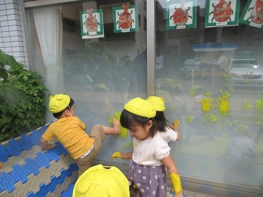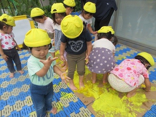 手足も、洋服も、黄色になって段ボールにもぬりぬり。これはね、ほら、もうすぐお月見。そうそう、それになるんですよ(秘密ね)