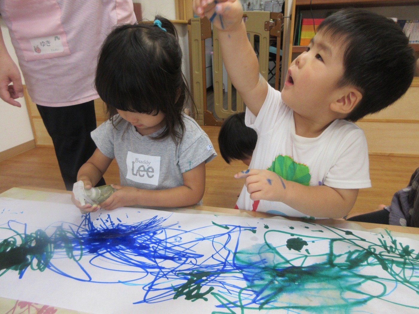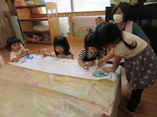 お絵描きをしていますね。お友達が描いているものを覗き込んでなにやらお話中。お話をしながら描きたいものがどんどん増えていくみたいですよ。