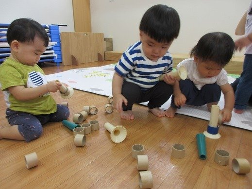 糸巻の芯がとっても楽しいおもちゃになっています。向きをかえたり、輪っかをいれてみたり。