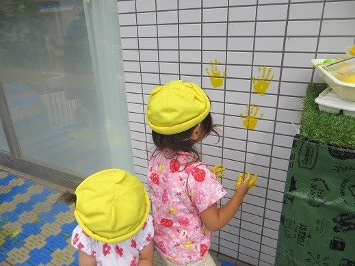 アートは紙の上だけではありません。壁にペタッ。かわいい手型がついたね♪