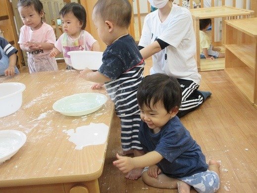 小麦粉で遊んだ日もありました。粉のさらさらとした感触、気持ちがいいんですよね。さらさら~ さらさら~といつまでも触っていたい気持ち、わかるよ~。
