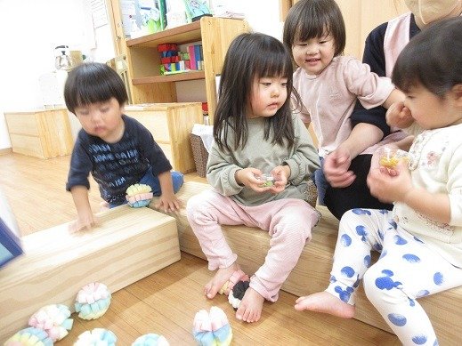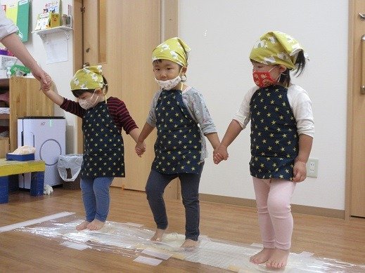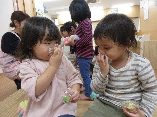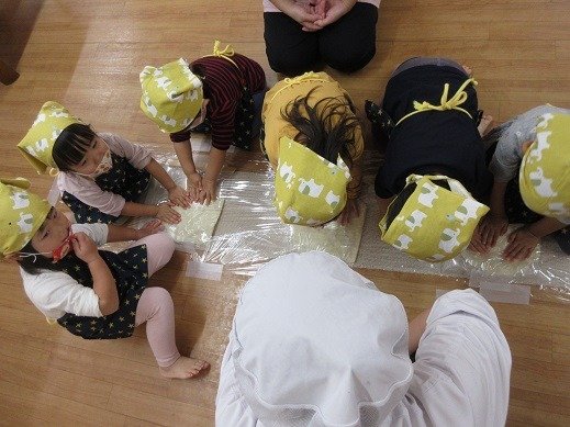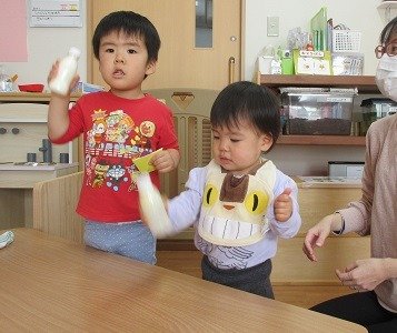少し手に取って感触を感じたら、匂いをかいで感想を教えてくれました。お昼寝から起きる頃には、お出汁のよい香りがしてきて、みんなの作ったおうどんを3時のおやつでいただきました。おいしかったですよー♪