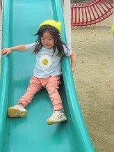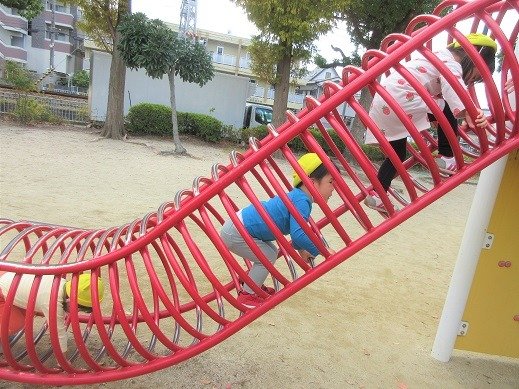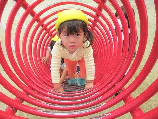 いろいろなサイズの滑り台や、ネットのはしご、一本橋…。おもしろい大型の遊具に「ちょっとこわいから・・・」なんて言っていたお友達も、いつの間にか一人でスタスタと渡れるようになっていたりして、みんなのチャレンジしたい気持ちがむくむくと見えました。