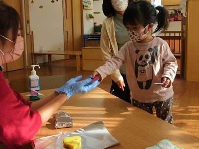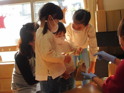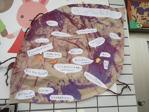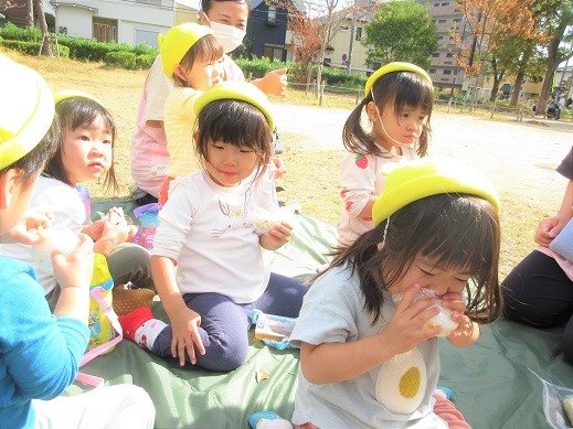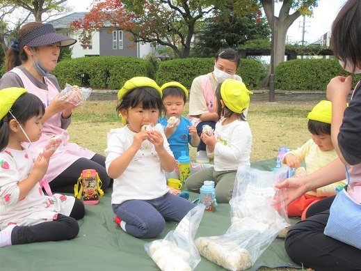 バターができたら、焼き立てのサツマイモをお買い物。かわいい袋(自分達で顔を描いたサツマイモさんがついています)に入れてもらいました。ホクホクのサツマイモに、みんなのバター!想像してみてください。ほ~ら 美味しそうでよ・だ・れがでちゃいそう(笑)帰りに公園で食べたお友達もいたみたいですね。お天気も良かったからきっと嬉しかったでしょうね。先生もおすそ分けしてもらいました。美味しかったー!また楽しいクッキングしようね。