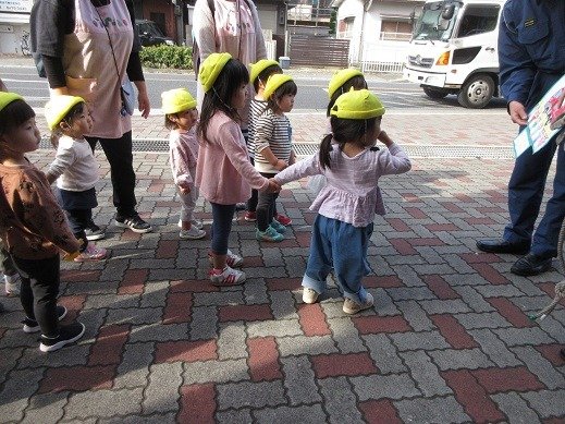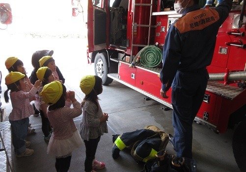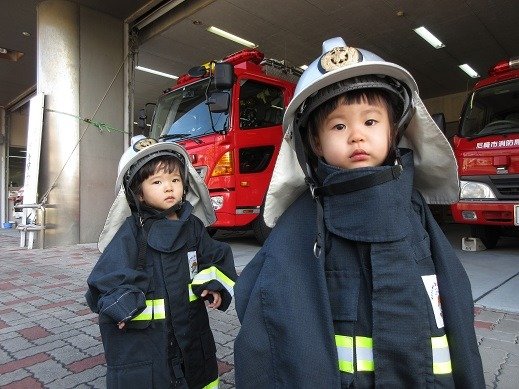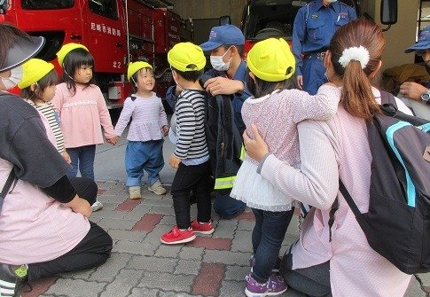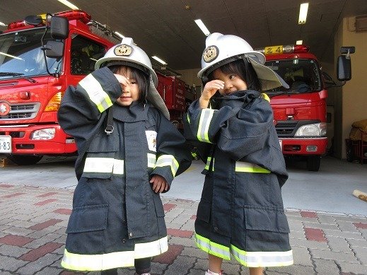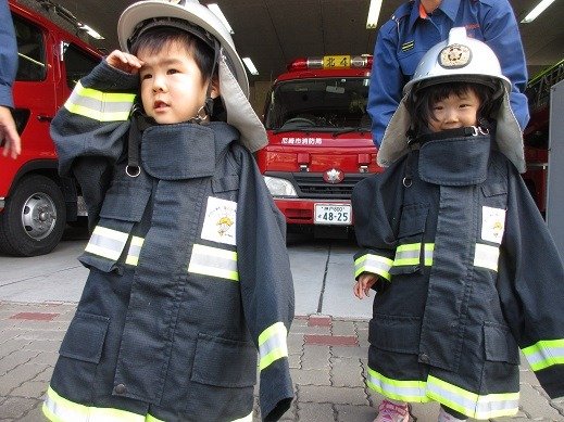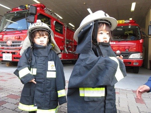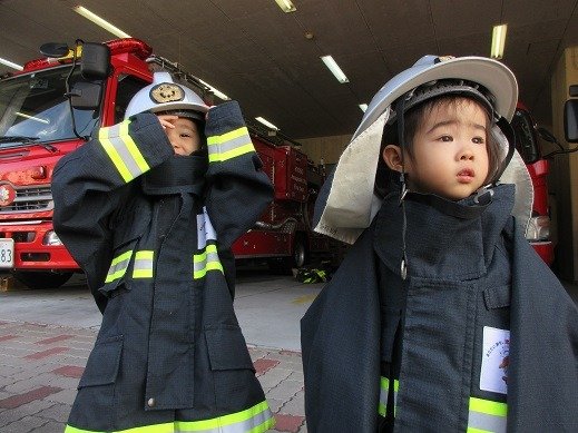 「私も着たい!」と自己アピールのうさぎ組さんたち。せっかくだから着せてもらいました。小さな体には重たい服だけど、くま組さんと同じことがしたいもの♪このキョトンとした表情がまたたまりませんでしょう??消防士さんたちも「かわいいなー」と言ってくれるものだから嬉しくって。