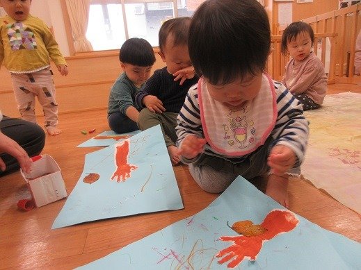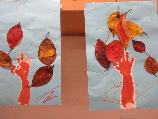 星グループさんは、公園で拾った落ち葉を貼って、秋の木を表現しています。かわいいおてての木いいでしょう。