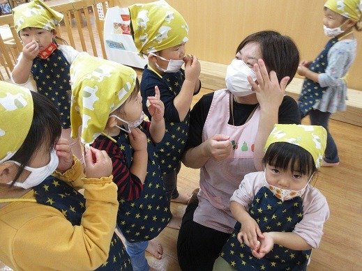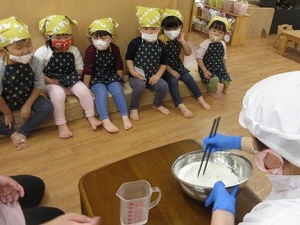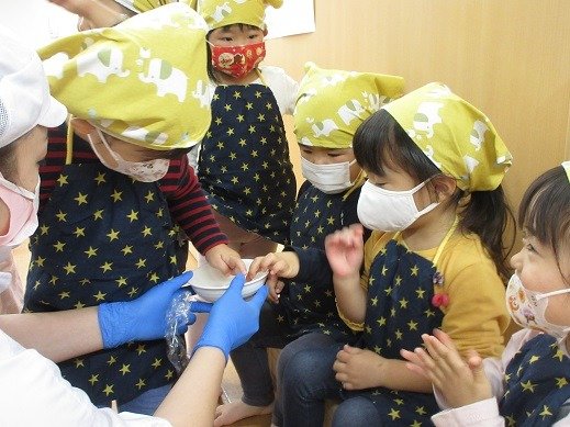クッキングは、1年を通していろいろな作業を経験してほしいなぁと考えています。乗せる・塗る・混ぜる・包む・・・少しずつ難易度があがっていきますよ~。