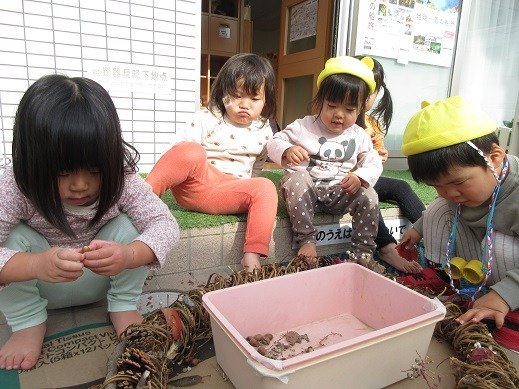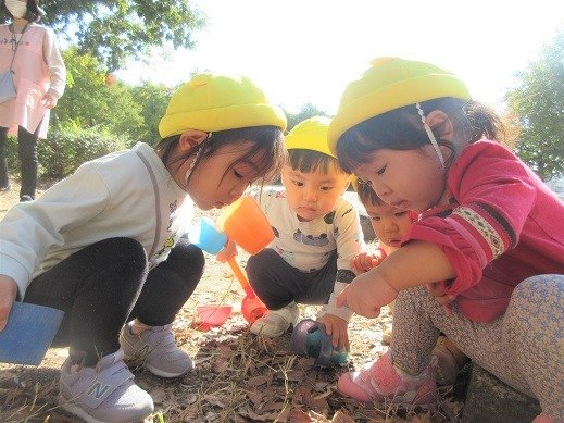 お砂を掘って、拾ったドングリをのせてごちそう作り。「あ!何かいたよ!」「どこどこ??」小さな頭が大集合