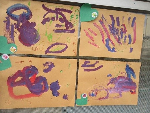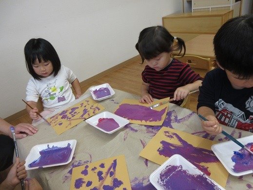 どうです?おいしそうでしょう!クレパスを使って葉っぱも描いたんですよ。大きなお芋は何にして食べようかなぁ。焼き芋もおいしそうだね!